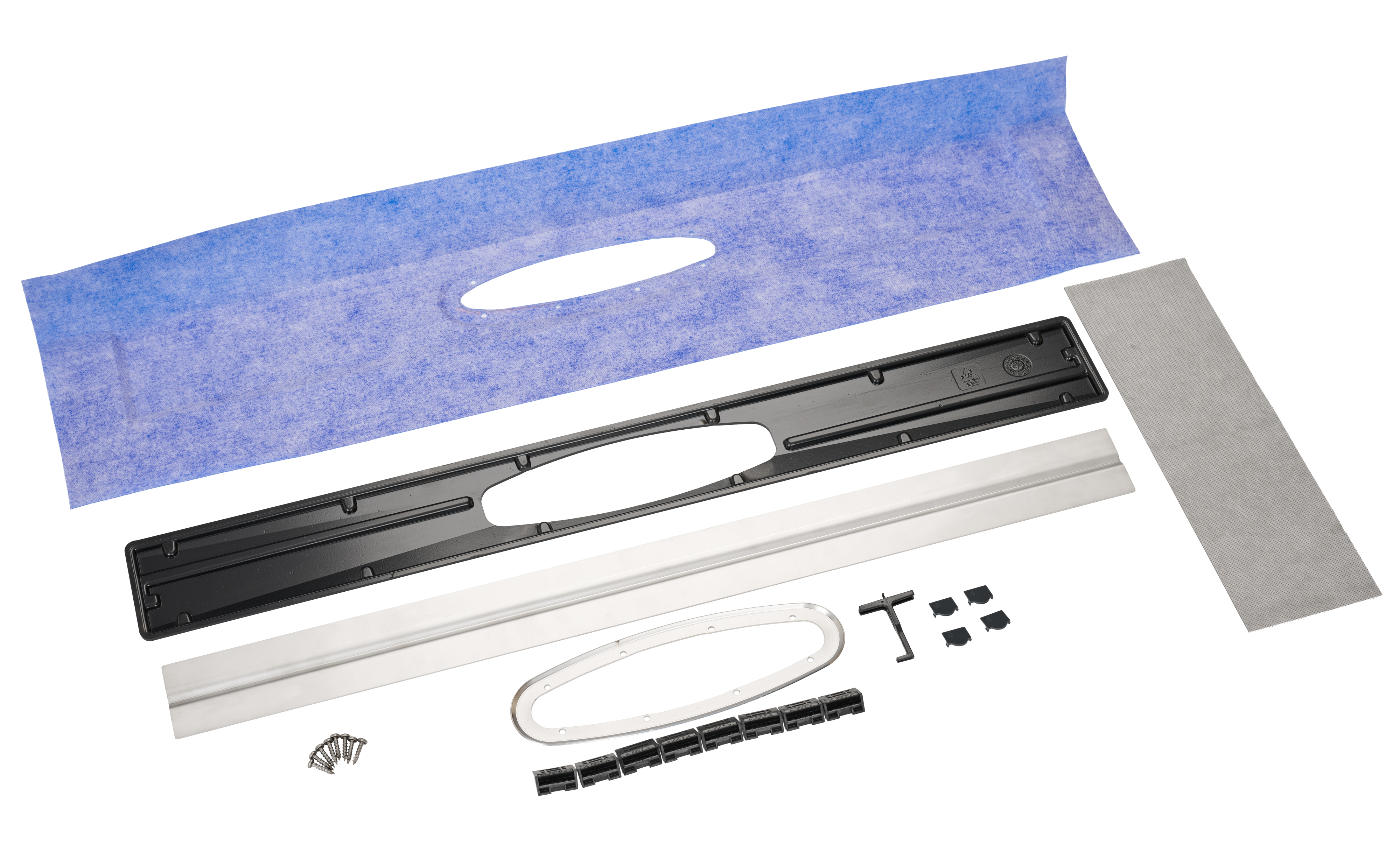 The package contains a tileable cover, frame, membrane flange, clamping ring, and accessories. The drain and mounting plate package is sold separately.